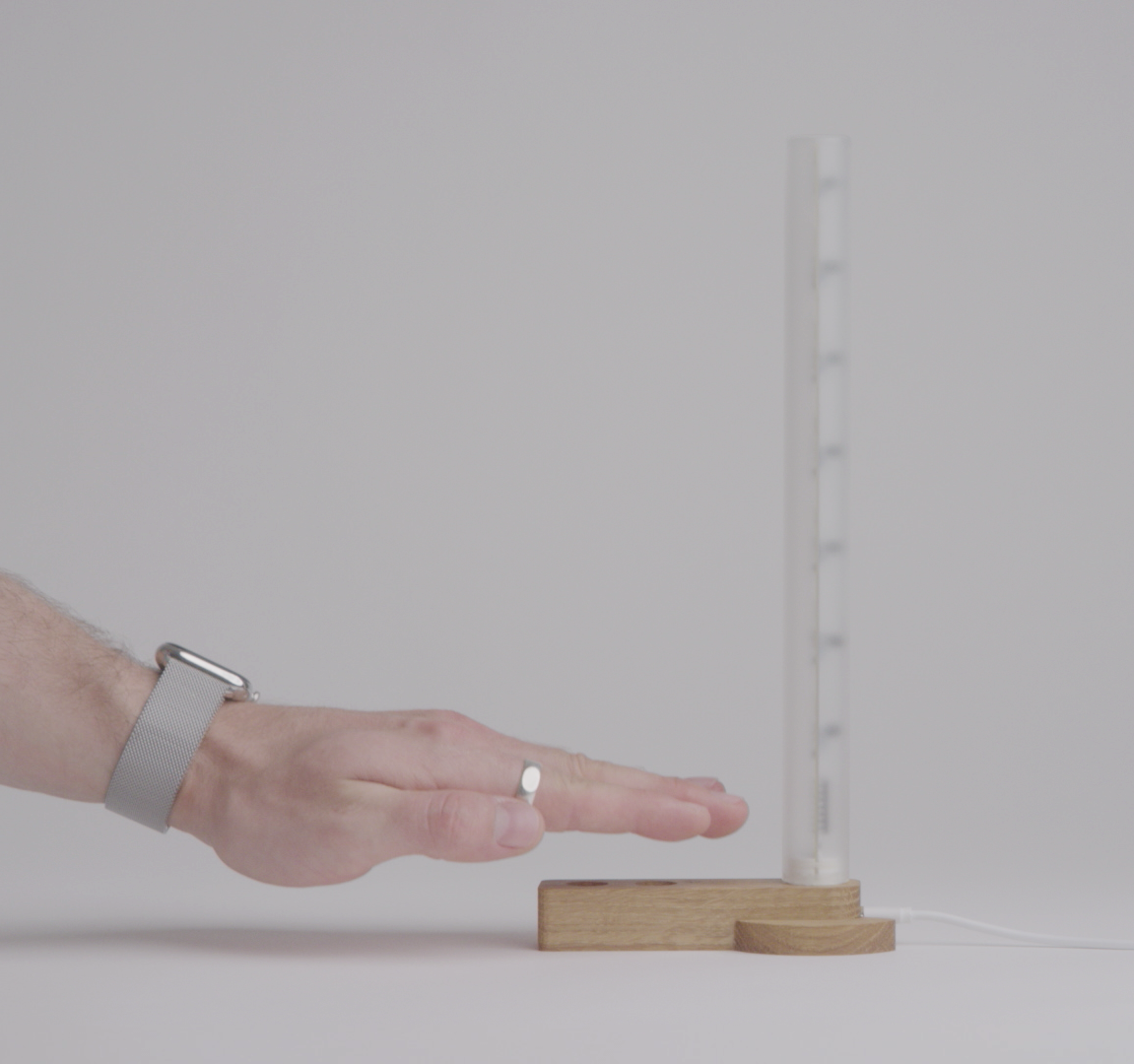 Dank der Sensoren im Sockel wird die Lampe mit einer fliessenden Handbewegung eingeschaltet. Von dort aus kann die Lichtintensität eingestellt werden, indem man die Hand entlang des Lampenkolbens nach oben bewegt, um mehr Licht zu erhalten, und zurück zum Sockel geht, um die Lampe schliesslich wieder auszuschalten - so werden die nicht greifbaren Eigenschaften des Lichts konkretisiert.